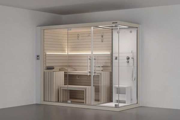 Découvrez Sasha, la solution tout-en-un signée Jacuzzi®, qui combine sauna, hammam et douche émotionnelle dans un seul espace raffiné.