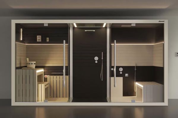Sauna, hammam et douche sensorielle réunis pour une détente complète.